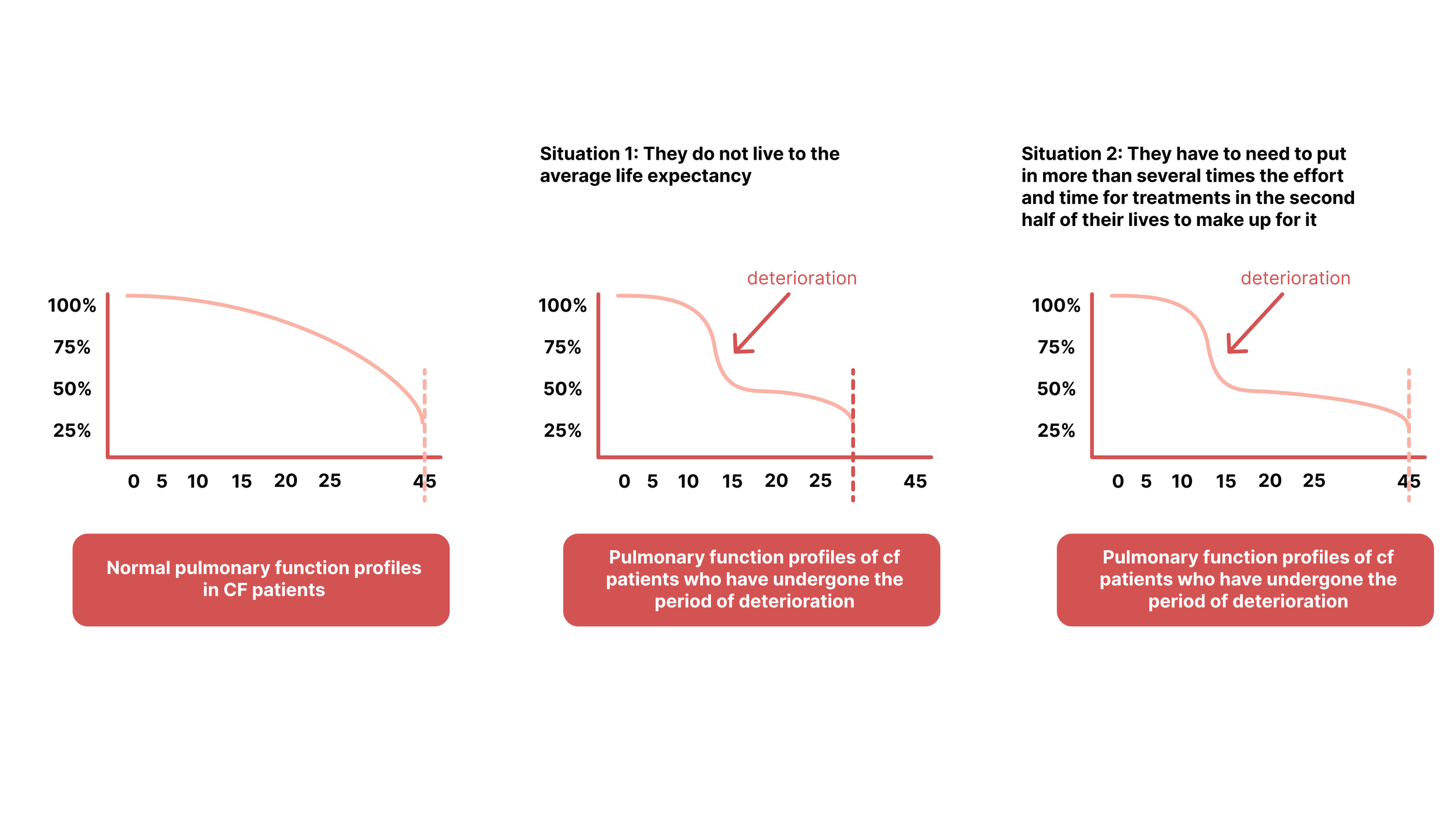Patients' lung function declines curvilinearly over their lifetime. However, it is difficult to compensate if lung function declines very much at a young age.