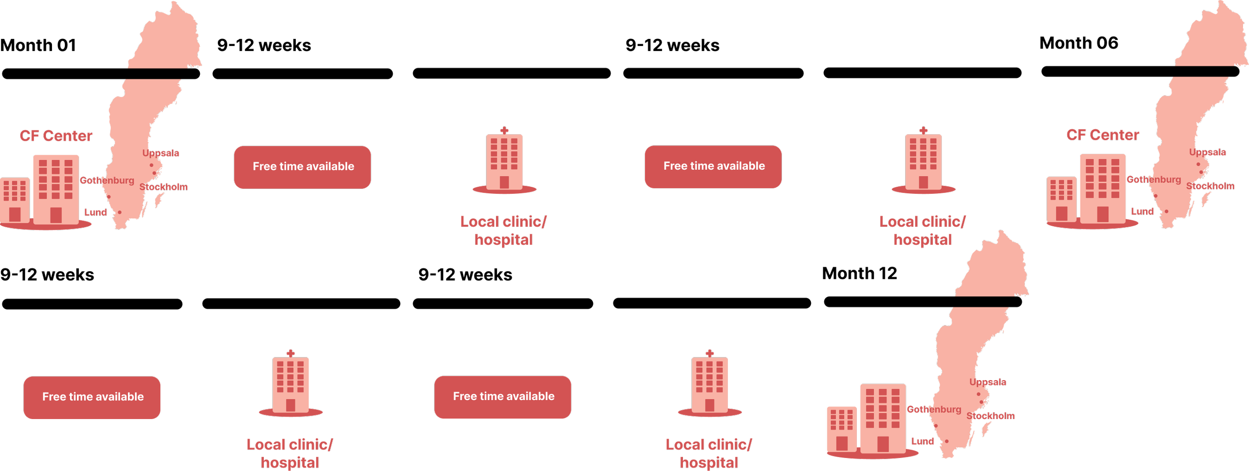 Cystic Fibrosis(CF) patients/families are required to visit the CF Center for CF screening every 6 months. In Sweden, there are 4 CF Centers located in southern Sweden, which means patients that live in other areas, for example, in the north, must travel all the way down to the south. In addition, patients also need to go to a local hospital for routine checkups every 9-12 weeks.
